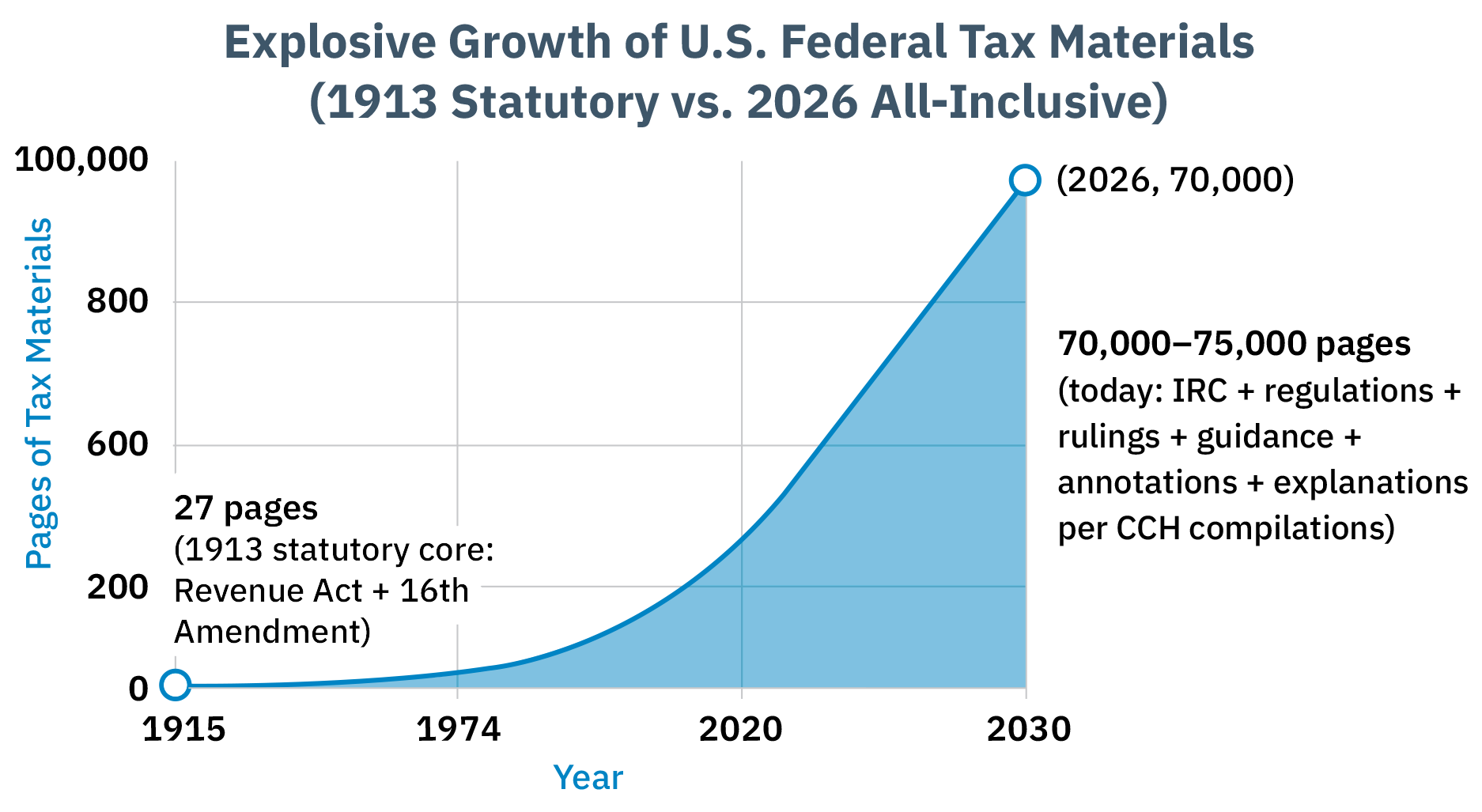 Fast forward to today, as of the time of this writing, the Internal Revenue Code has gone from a quaint 27 pages at its 1913 inception, to 6,871 pages today. If you include IRS regulations, revenue rulings, official guidance, annotations, court cases, and explanations – materials that interpret and apply the law but are not the code itself – the number of pages balloons to 70,000 – 75,000.